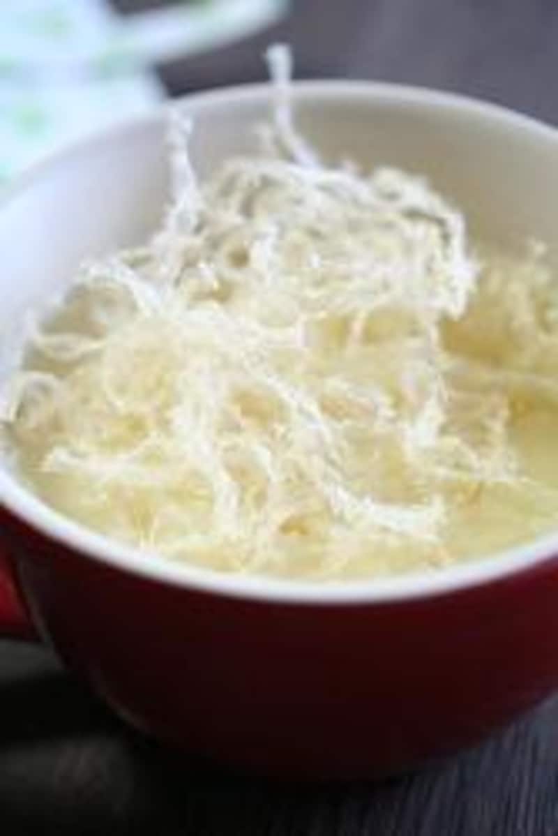 | 例1:市販の豆乳カップスープに糸寒天を加えると豆乳スープ麺。 | 例2:粉寒天を加えると、とろみがついてダイエット&デトックスポタージュ。 |