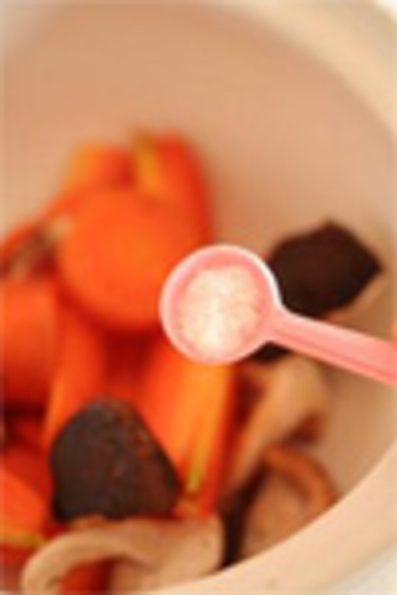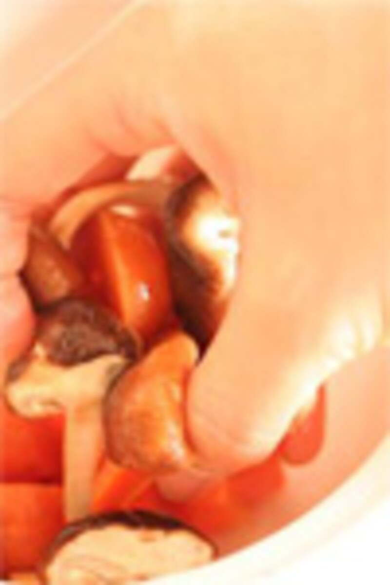 1.にんじんはよく洗い、硬い部分を取り除き、皮付きのまま食べやすくきり、しいたけは半分に裂く。