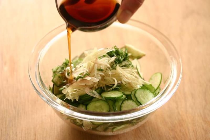 | めんつゆでうまみをプラス。 | あとは軽く混ぜて冷蔵庫でなじませましょう。 |
