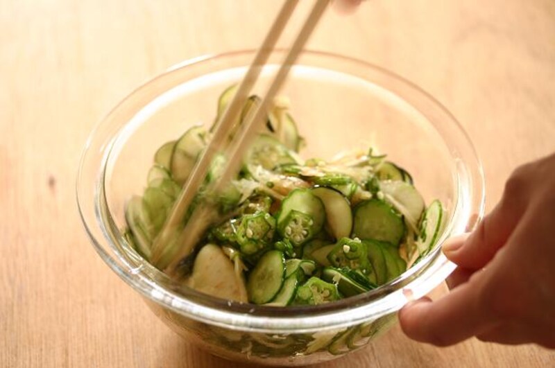 1. ナスは薄めの半月切り、キュウリとオクラは輪切り、みょうが、生姜、大葉は千切りにし、めんつゆに漬け込み、よく冷やしておく。