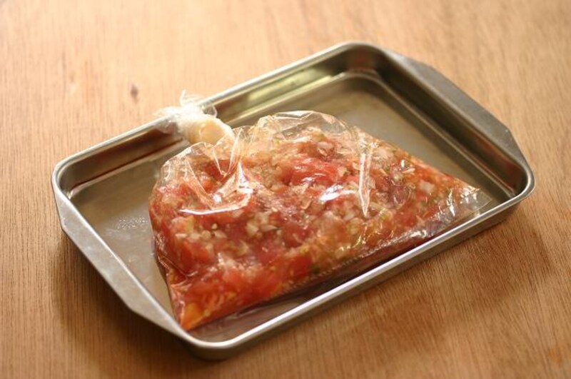 2. レモン汁、塩、こしょう、タバスコで味を調えてビニール袋に入れて、平らにして金属のバットにのせて、1時間冷凍する。