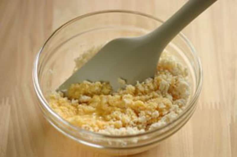 (2)別のボウルに溶きほぐした卵とおからを加えて、へらで混ぜる。