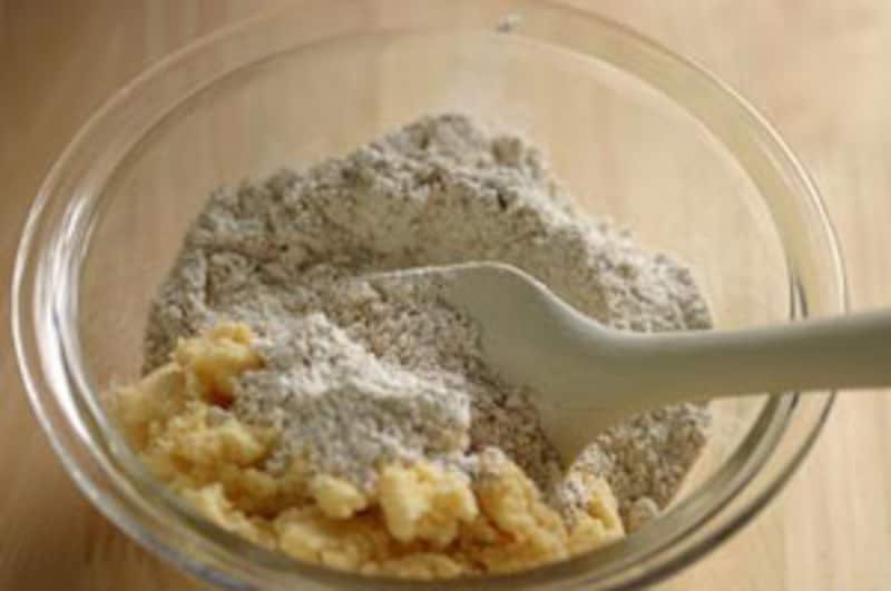 (1)ボウルに薄力粉、ベーキングパウダー、砂糖、塩を入れて混ぜる。