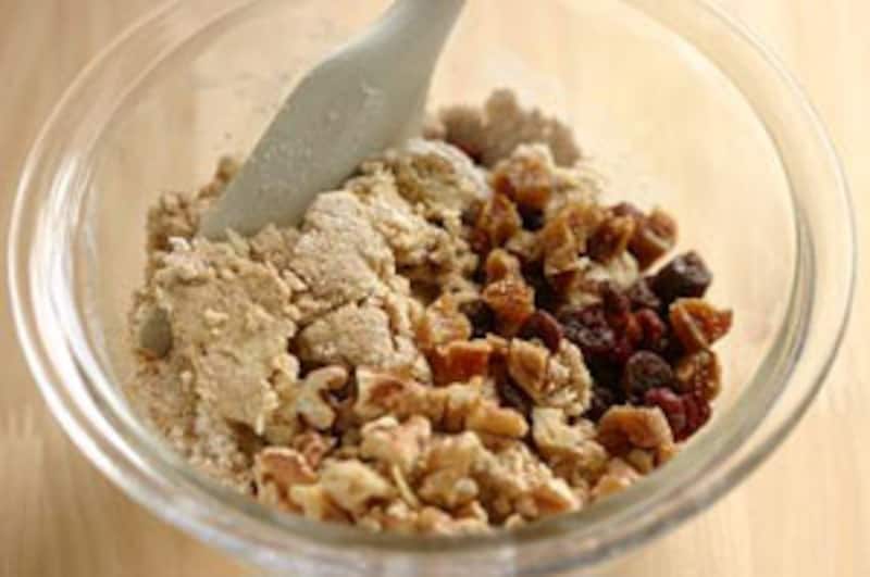 (5)半分くらい混ざったら、お好みのドライフルーツとくるみを加える。