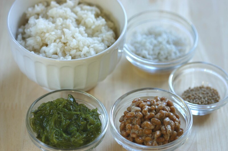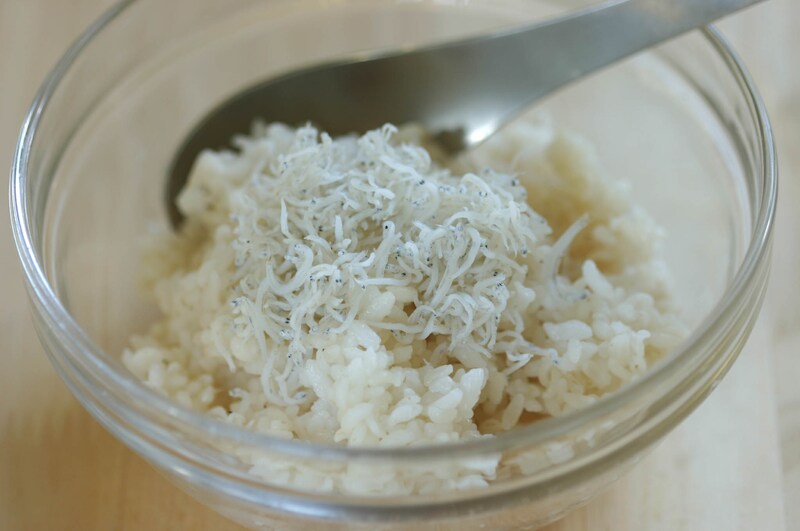(1).大麦ごはんにしらす干しをのせて電子レンジで温めて混ぜ、茶碗に盛る。