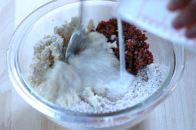 (2).ボウルにAを加え、スプーンで混ぜる。高きびとおからと牛乳も加え、さっくり混ぜる。