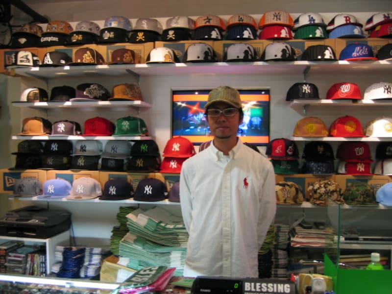 | 店長の吉川さん。後ろのキャップ(\5000前後)の品揃えは福岡随一。 |