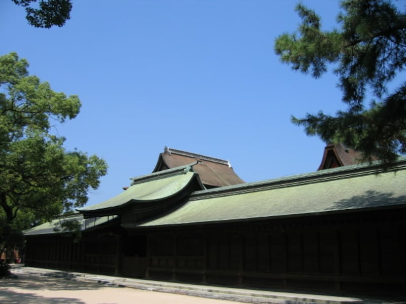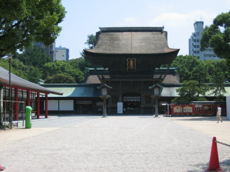 | 筥崎宮正面。天文15年(1546年)に大内義隆によって再建された本殿・拝殿、文禄3年(1594年)に筑前名島城主・小早川隆景によって再建された重要文化財の楼門 |