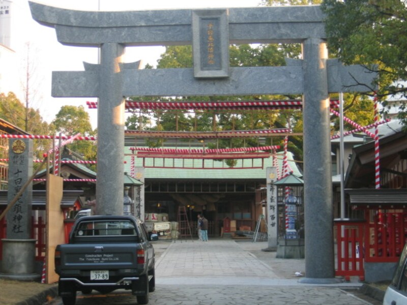 ここ筥崎宮の正月最大のイベントは、3日の玉せせり(玉取祭)。筥崎宮境内で湯と白絞油で清められた宝珠が末社の玉取恵比須神社まで運ばれ、ここで宝珠が氏子に手渡されて祭が始まります。陸組と浜組に分かれ、陰陽2つの玉を300人の男たちが奪い合い、豊作か大漁を占うとされる。寒い中でもふんどし姿の男衆の熱気が湯気と変わる勇壮な風景を見に行くのも楽しいはず。