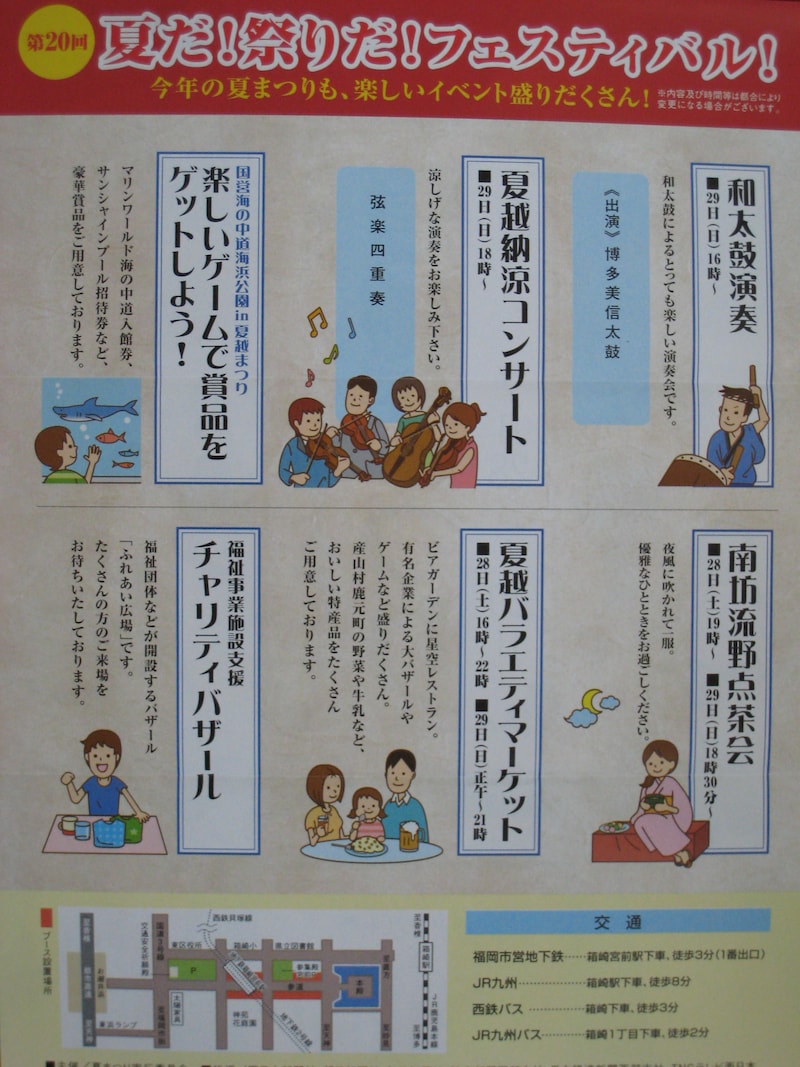 今年で20回目をむかえる筥崎宮の夏越まつり。福岡の夏の風物詩として定着してきた感のあるまつり。ゆかたなど着て、ちょっと出かけてみませんか?
