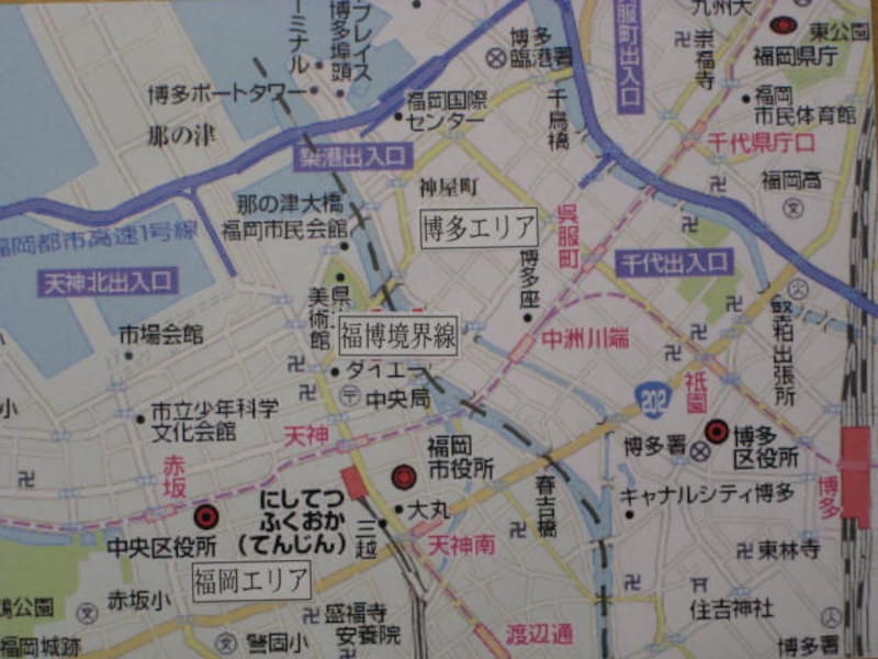 | 博多と福岡の位置関係。地図中央の那珂川を境にして、東が博多、西が福岡。 |