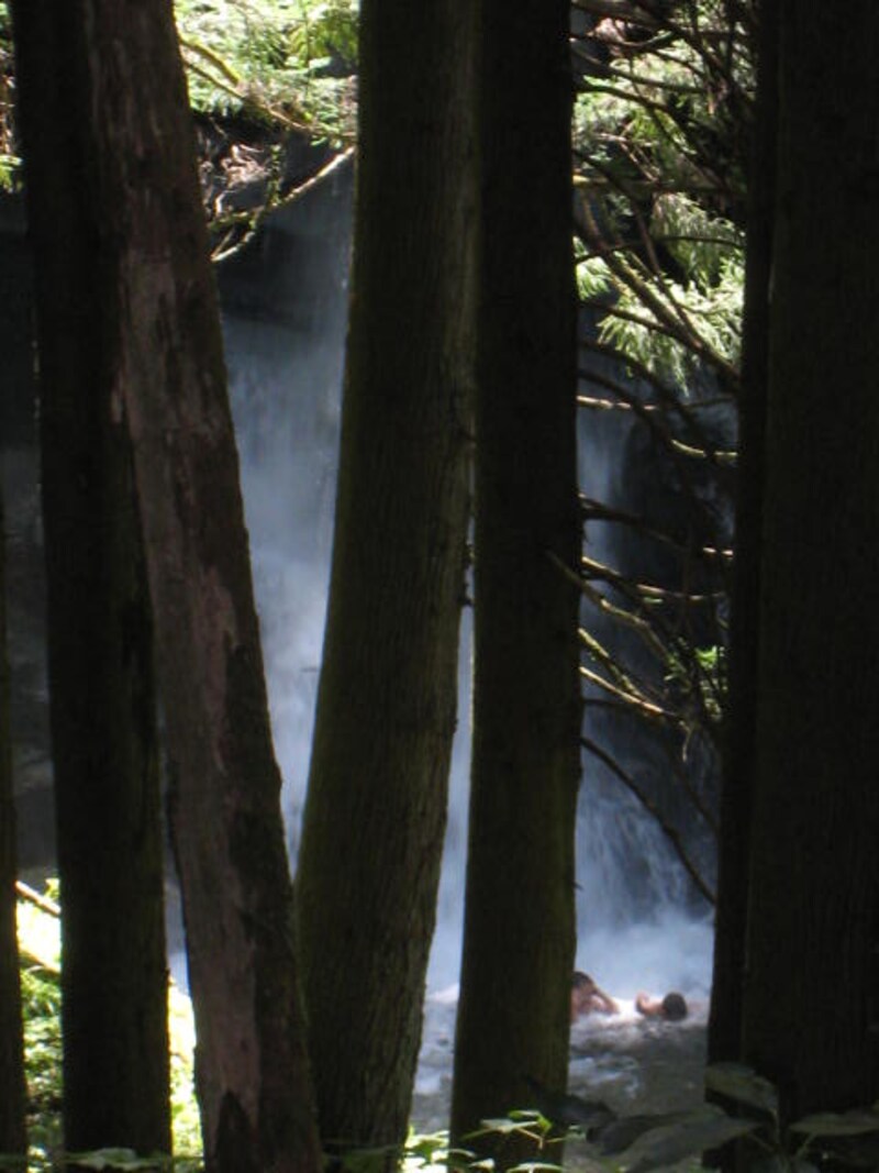 杉の木々の隙間から水飛沫が垣間見れ、涼やかな滝の音が聞こえてきます。慎重に坂道を降り終わると、そこは清涼感いっぱいの空間が広がっています。滝つぼはそれほど深くなく、膝まで足を入れることが出来るところもあり。靴を脱いでひんやりとした水に浸してみるものいいですよ。