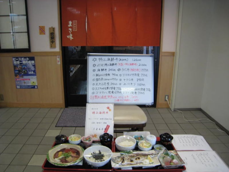 各店舗の前を品定めしていると、とても気になるメニューを発見。上の写真の如く、海鮮丼となっているものの具材とご飯が別々に展示。何の迷いもなく暖簾をくぐることにしました。
