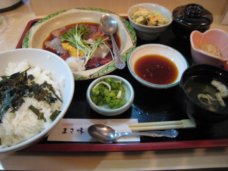 | まさ味の特選よくばり海鮮丼(\2100)。なんとご飯と具材が別の皿に盛られて出てきます。マグロのかんぱち、鯛、貝柱、いくらにうににエビ、イカと盛りだくさん。 |