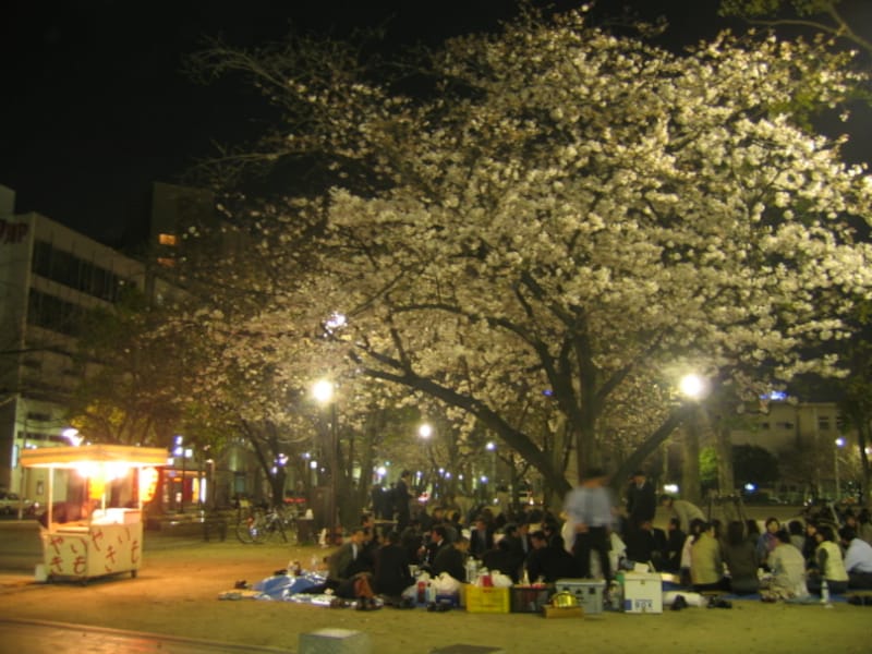 次にご紹介する場所は、博多区上川端町の冷泉公園。意外かもしれませんが、冷泉公園内には立派な桜の木があるのです。写真は夜の冷泉公園の風景ですが、近くの会社の花見の宴会で盛り上がっているように、ちょっとした穴場的なスポットです。中洲に近いという場所柄、夜は花見の宴会などで賑わいますが、週末などの休日の昼間は近所の方々が訪れるくらいで、意外なほど静かな空間です。花見をするなら週末などの休日の昼間。ゆっくりと花見が出来、ちょっと休憩する場所はすぐ近くの上川端商店街などがあり、楽しい午後のひと時を満喫できるのではないでしょうか?