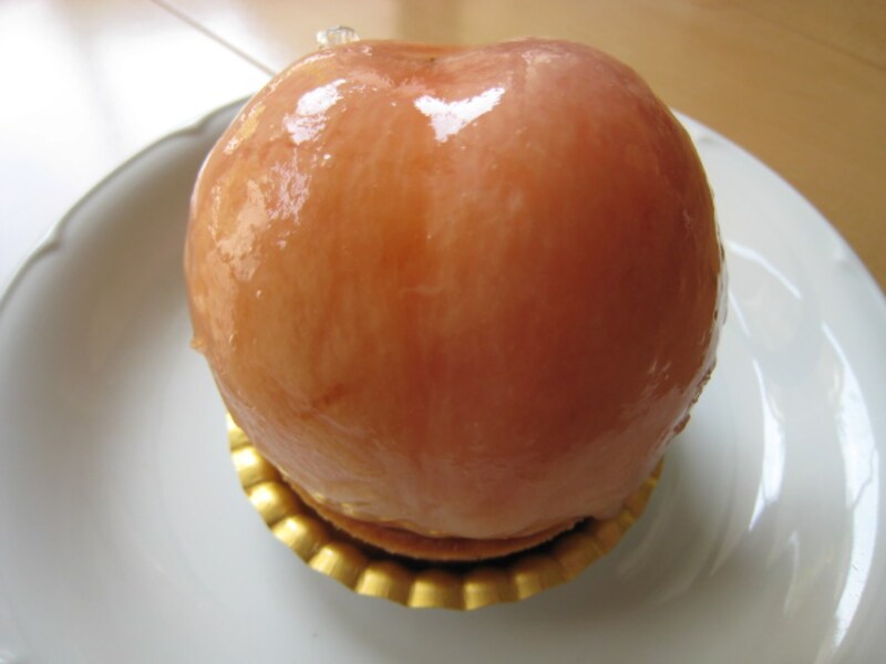この『まるごとピーチ』、写真のように土台にクッキー生地が見える意外は桃そのもの。そんな『まるごとピーチ』にフォークを当てると、当て口からジューシーな果汁が溢れてきます。フォークに伝わる力加減は、まるで桃をそのまま食べているのではと思うほど。そしてフォークを桃の中心部に進めると、スッと今までの力でフォークが桃の中心部に入っていく感覚が分かります。