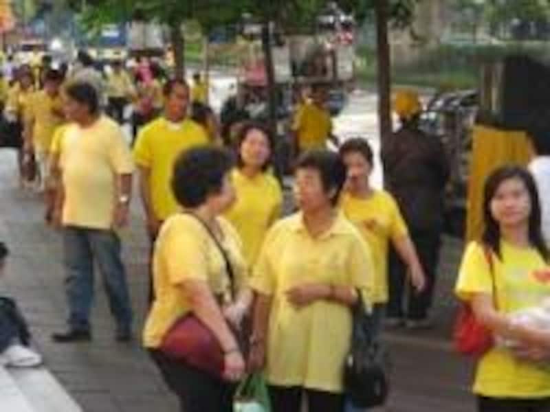 | 街行く人々が国王のシンボル・カラーである黄色の洋服を着てお祝いの気持ちを現している |