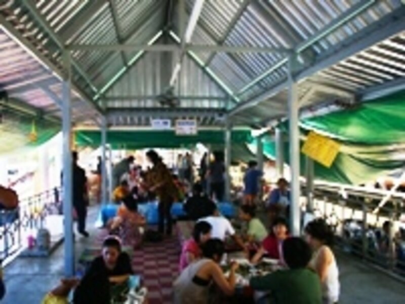 来ている人たちのほとんどはタイ人家族連れ。週末を利用して、水上マーケットピクニックで家族団らんを楽しんでいるようです。ビールやウィスキーも注文できることもあって、宴会を開いて盛り上がっているグループも。水辺で心地よい風に吹かれながら昼間から飲むお酒はきっと美味しいのでしょうね。桟橋のまわりの水上マーケットの規模はそれほど大きくありませんが、タイらしいのんびりしたムードが楽しめます。