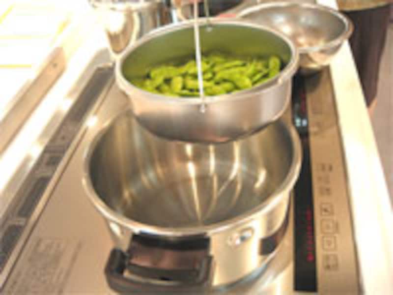 こうした「固い野菜を蒸す」のも圧力なべの得意ワザ。他にもじゃがいも、にんじん、卵(なんと、ゆで卵も作れるそう)を同時に圧力なべにかけて蒸せば、短時間でポテトサラダの下ごしらえが完了します。