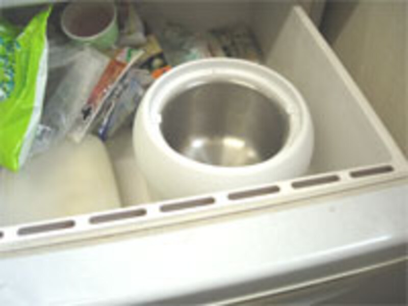 まずは保冷ポットの準備から。直径20cm近い大きさなのですが、冷凍庫の中では他の食品などに触れないようにすき間をあけて置くのが注意点です。そうしないと冷え方が充分にならないとのこと。