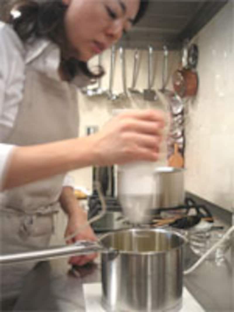 バーミックス使用の際には、クリステルの「ミルクパン」が大活躍。小型で深めなのでそのままバーミックスが使えて、その後もすぐに火にかけられます。