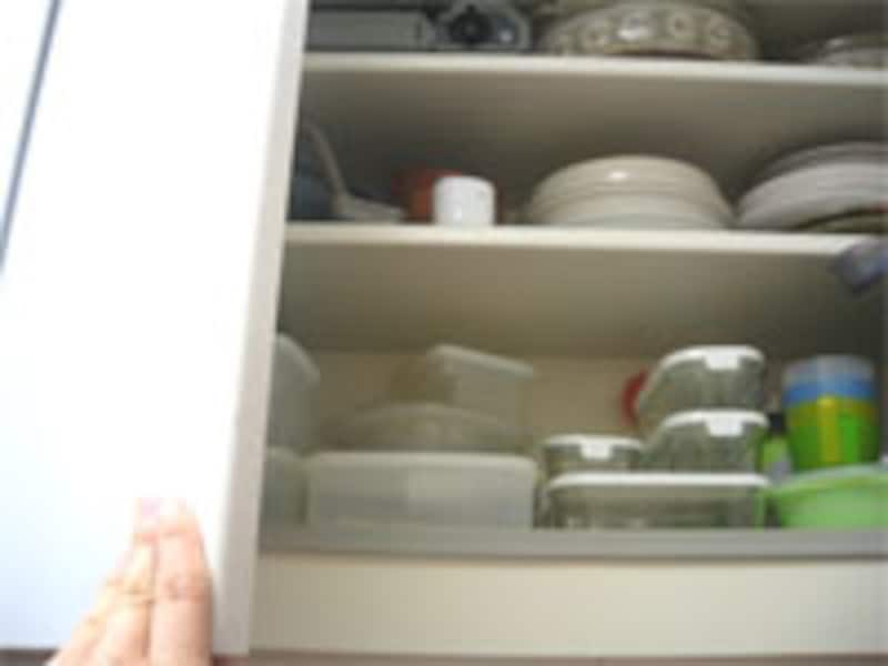 | 高い位置の吊り戸棚収納。専用のステップも欲しいけれど、場所を取るのでなかなか用意できないのが現実。 |