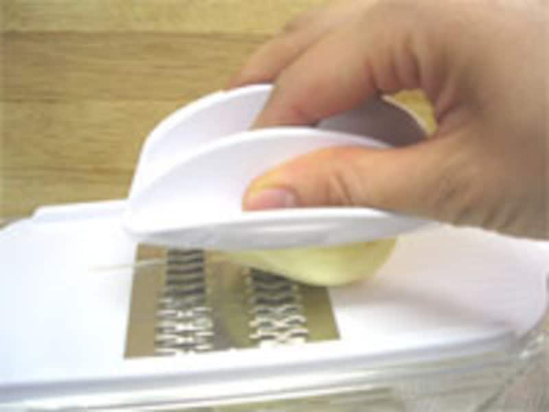 じゃがいものように長さのないものをスライスするときは、誤って指を切らないように「指ガード」を使用するのも忘れずに。スライスできなかった残りの部分のみ、包丁で細切りにすればムダなく準備完了です。
