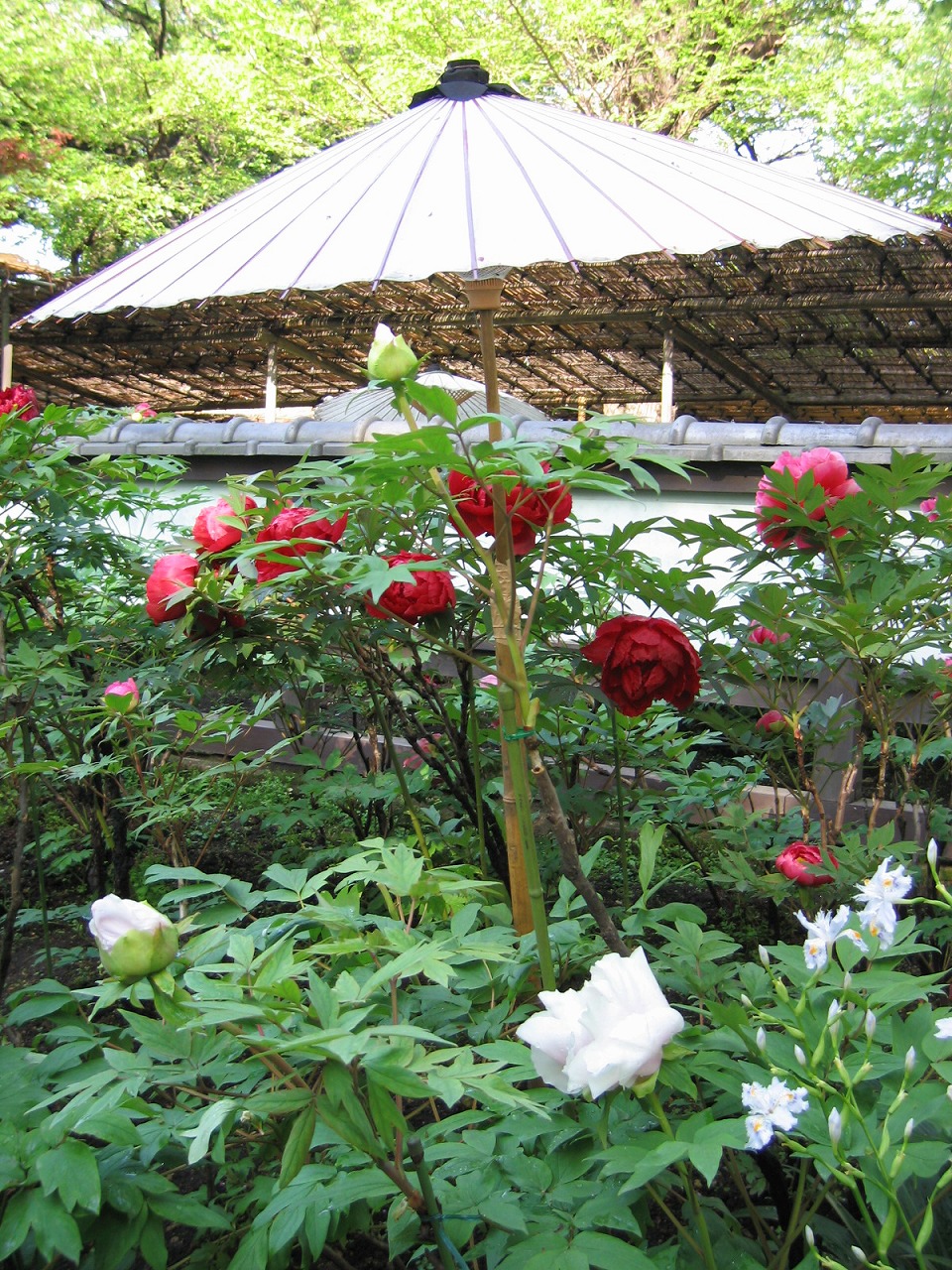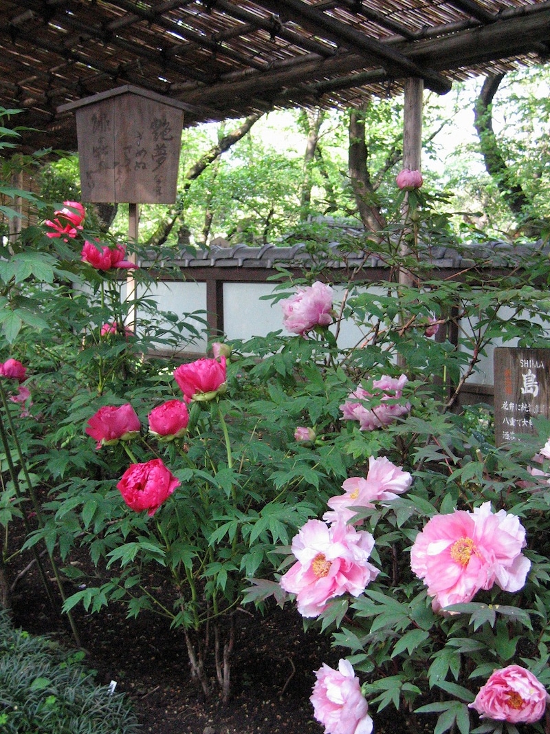 | 東照宮ぼたん苑は、他の花もあり、風流なしつらえです。こちらの写真は、2006年の4月24日の雨上がりに撮影したものです。 |