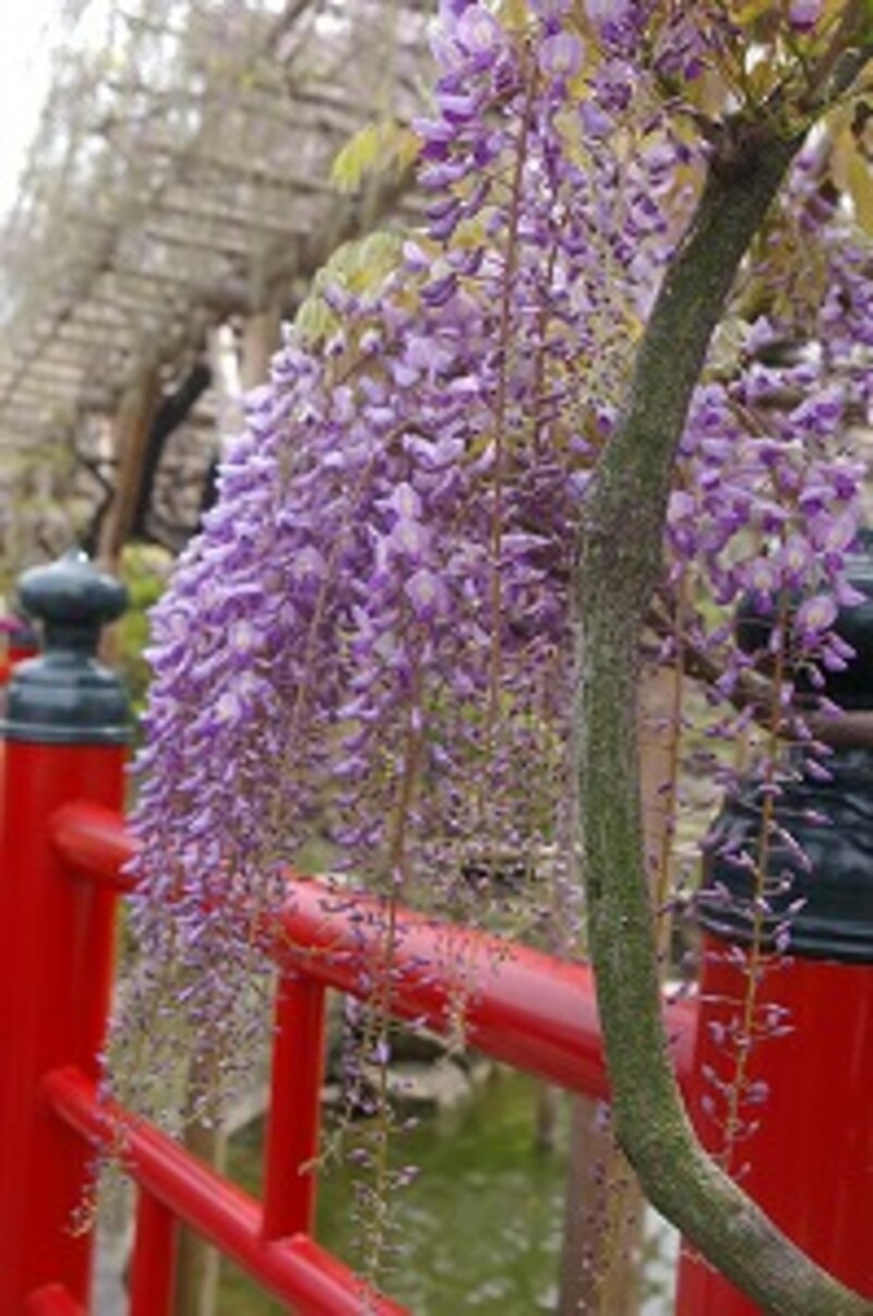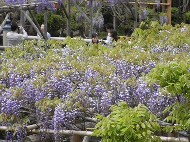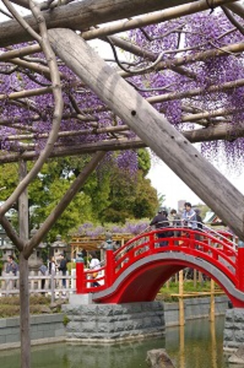 普通、天神様と言ったら梅の花が主役です。しかし、ここ亀戸天神の境内には、藤棚が縦横無尽に張り巡らされ、太鼓橋の上から眺めると、まるで藤の花の海に神社の建物が浮かんでいるように見えます。梅祭り初日の4月21日現在、早咲きの木がすでに5分咲きまで来ていますから、満開はもう近いでしょう。お急ぎください。