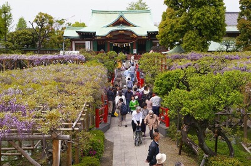 江戸の人々は植物と花が大好き。ソメイヨシノだけでなく新種のアサガオや菊を開発するなどして、庶民たちもガーデニングを楽しみました。神社やお寺の境内にも花の咲く木を植え、季節ごとに、人々の憩いの場として人気を集めました。現在も東京随一の藤の花の名所として有名な亀戸天神も、江戸時代からの名所で、安藤広重の「江戸名所百景 亀戸天神境内」という浮世絵に、現在の様子とよく似た太鼓橋と藤が描かれています。