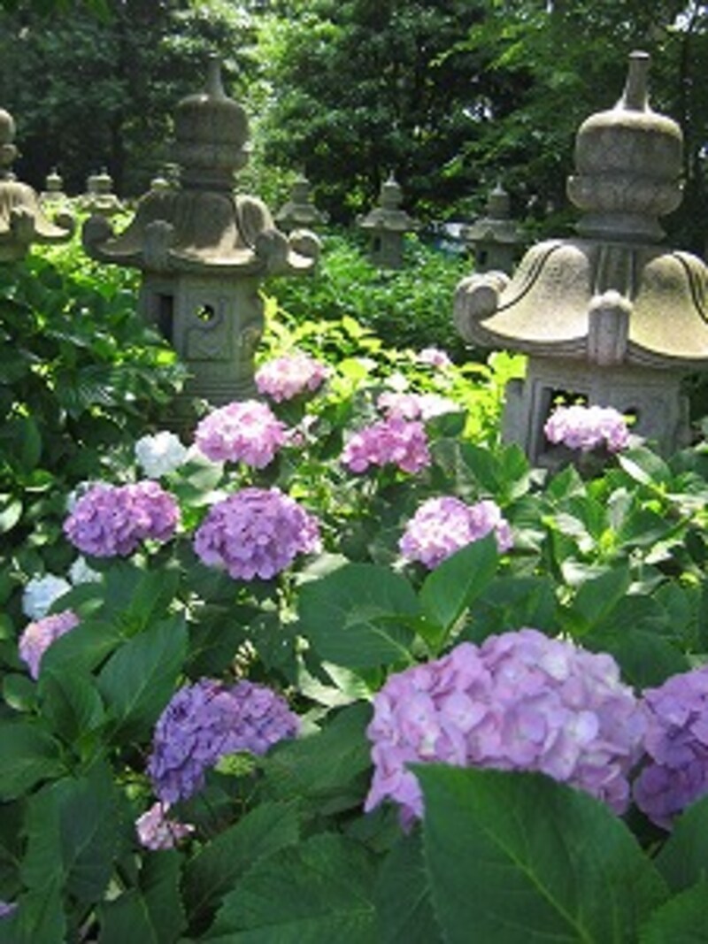 | 6月の妙法寺境内。石塔にはアジサイがよく似合います |