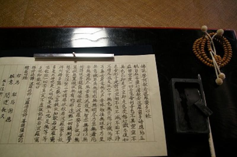 般若心経をいきなり自力で書くのではなく、下にお手本が敷かれていて、その通りに書けばよいので、お習字が苦手な人でも大丈夫。字の上手下手を競うものでもないので、ゆっくりと心を込めて書きましょう。しかし、うまく書けたからと言って、決して持ち帰らないようにしてください。お写経は、家の壁に飾るものではなく、仏様にお納めしてナンボのもんです。