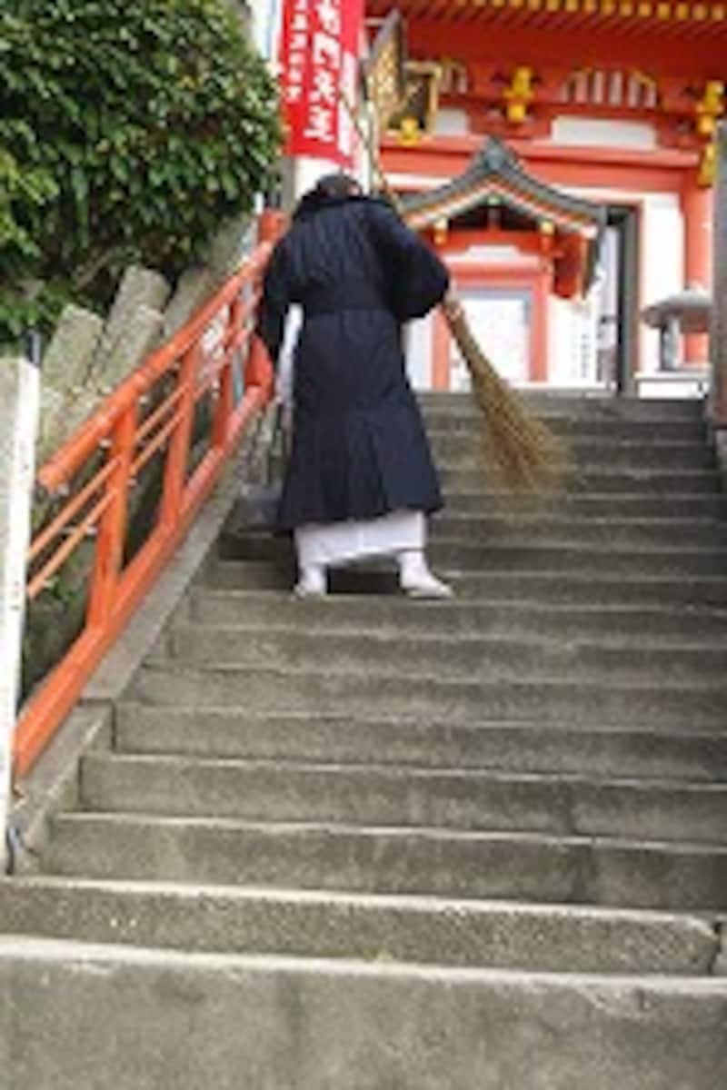 そうは言っても、こちらのお寺は、常に隅々まできれいに掃除されているので、われわれ素人が手を出す部分はあまりないようです。外の石段をささっと掃いて、ハイ、終わりでした。指導のお坊さんによれば、落ち葉の季節はなかなか大変らしいのですが、この季節は、そんなに葉っぱも落ちてませんしね。