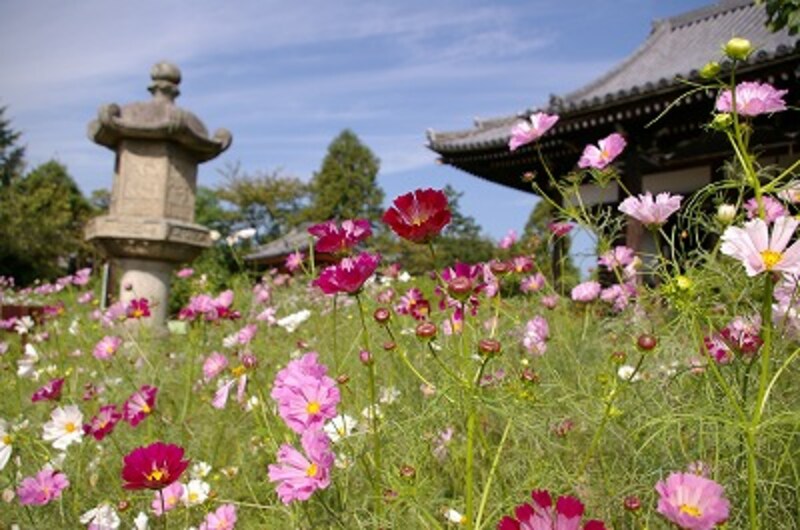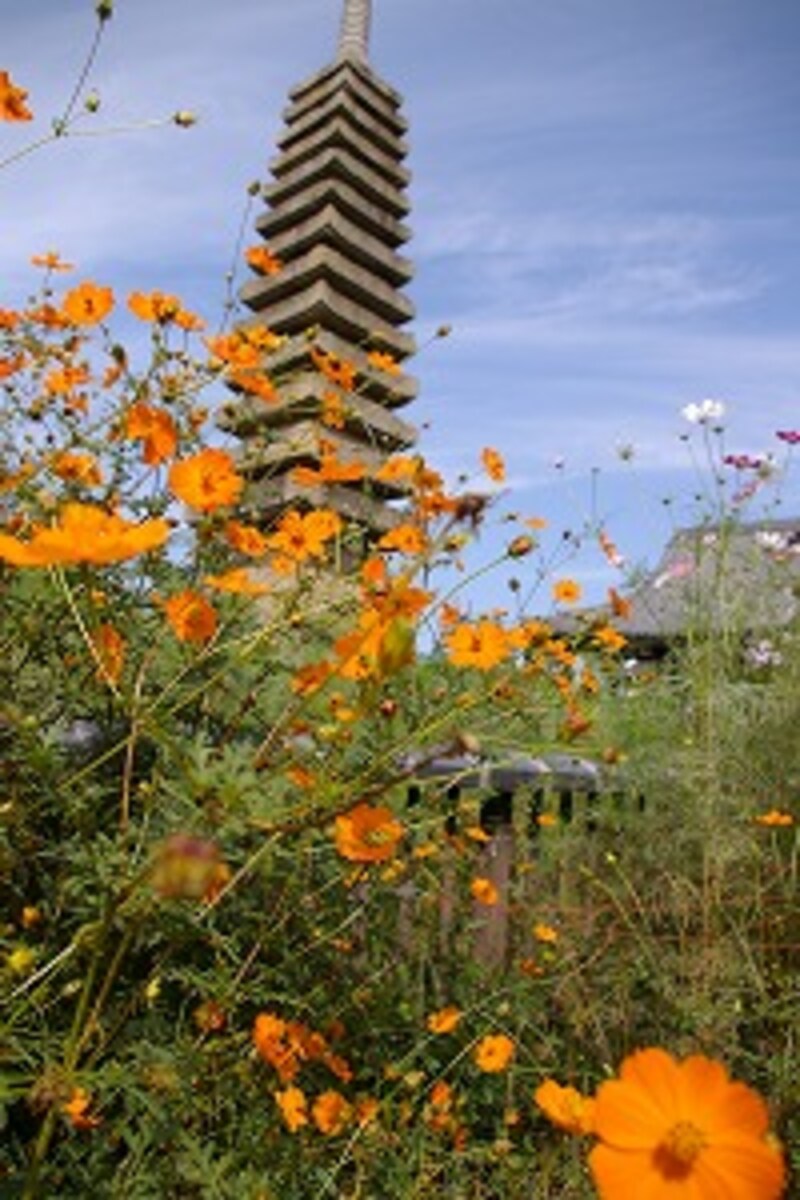 中でも見どころは国宝の楼門と、石でできた十三重の塔です。日本には、大きな石の塔はたいへん珍しく、これは、東大寺を再建する際に中国からやってきた職人さんが造ったとも言われています。そういえば、キバナコスモスに囲まれたこの塔は、どことなく異国的な雰囲気を漂わせています。