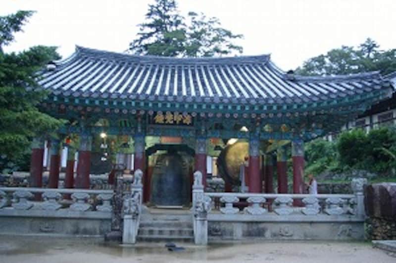 | 韓国の寺では、夕方と早朝に、鐘や太鼓の鳴り物を鳴らします。その後、お堂でお勤めがはじまります |
