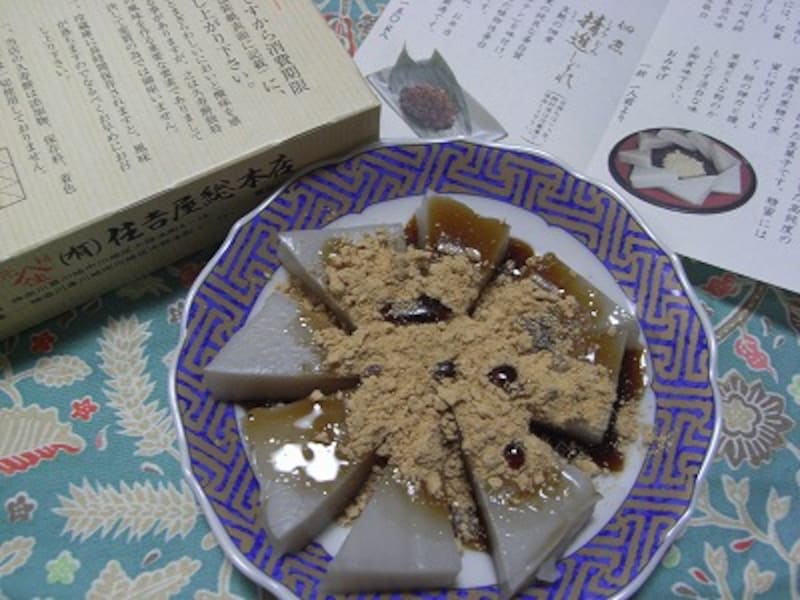 | 久寿餅の店はたくさんあるが、今回は、住吉屋総本店で買ってみました。しこしこの食感が魅力 |