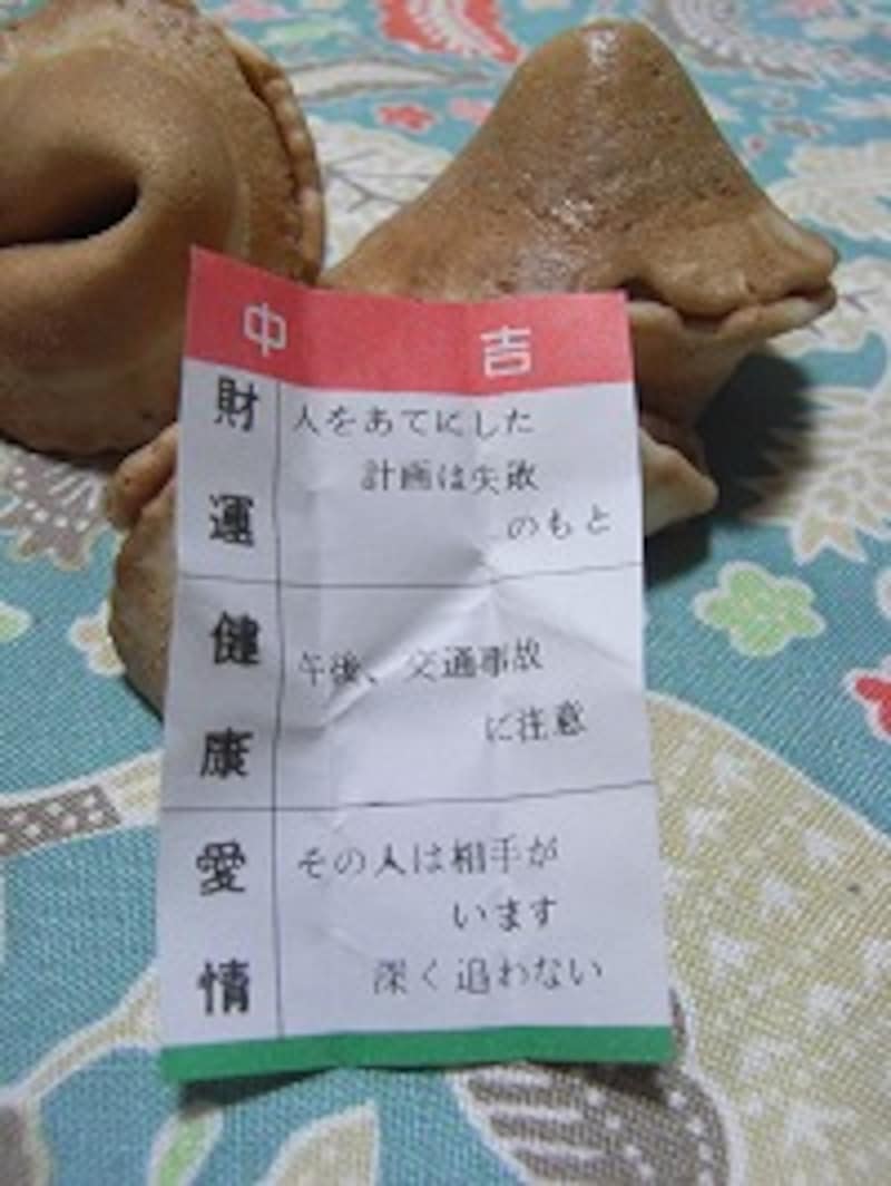 | おみくじせんべいの中のおみくじ。本日は、中吉。何事もほどほどが肝心ですね |