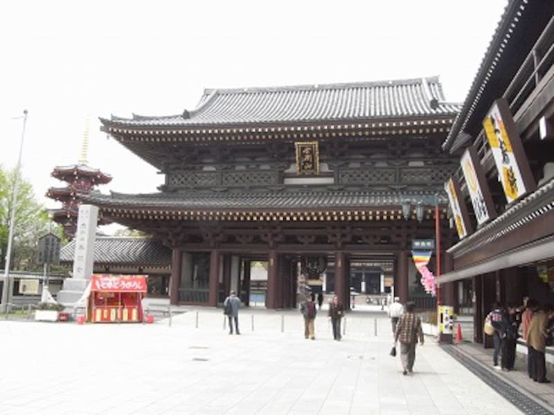 | 川崎大師の立派な門。右側は、名物の久寿餅の名店 |