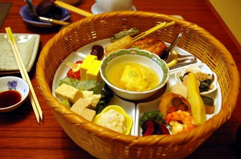 | 花かご弁当。これに茶碗蒸し、湯豆腐、デザートなどもついて2800円とは、かなりお手ごろ |