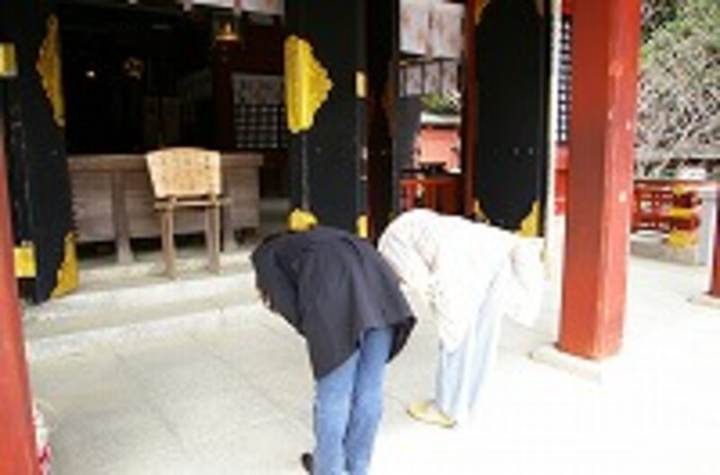 | 手水でお清めをする谷口先生。パワーチャージ旅行でのお参りは、作法に従ってきっちりと |
