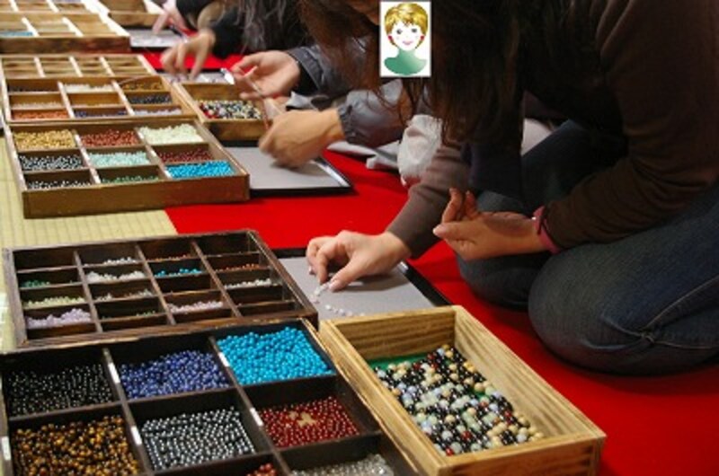 | 熱心に石を選び、数珠作りに励むM子ちゃん |