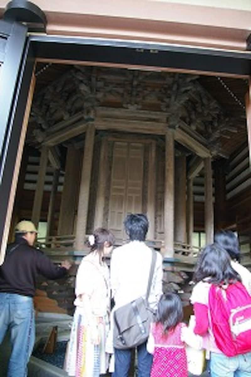どちらの観音様も、楠の一本造りです。一本造りとは、手などの部分は別として、体の基本的な部分を一本の木から彫る造り方です。こんな大きな観音様を造る木がどれほどの巨樹であったかが、想像できますか?