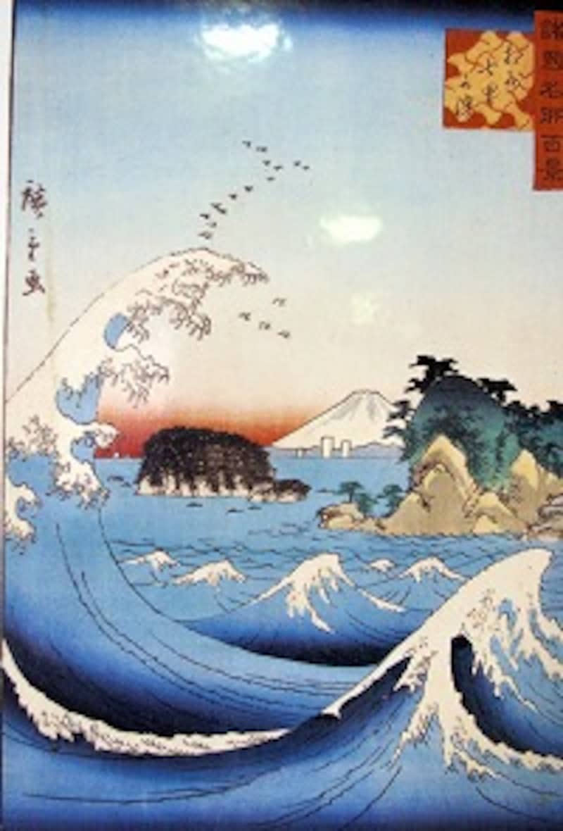 | こちらの浮世絵には、江の島と富士山が描かれている |
