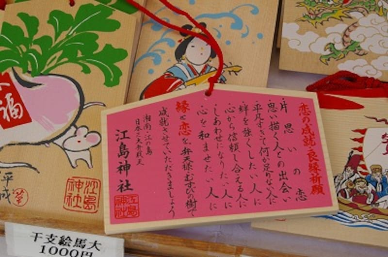 | 縁結びの絵馬には、こんなにいろいろのご利益がある。恋は一筋縄では行かないからね |
