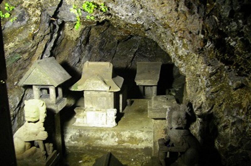 | なんだか怪しいムードの岩屋には、石仏や石塔がたくさんある |