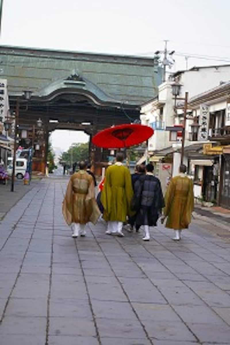 | 法要を終えてお帰りになる僧侶の皆さん。お朝事は、365日、毎日行われる |