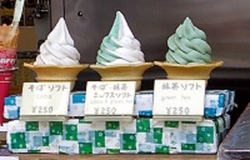 このごろでは、観光地に行くと、その地の特産品を使ったいろいろな味のソフトクリームがありますが、蕎麦味ほど意外性があるものは珍しい。蕎麦味と抹茶味のカップリングも面白すぎます。