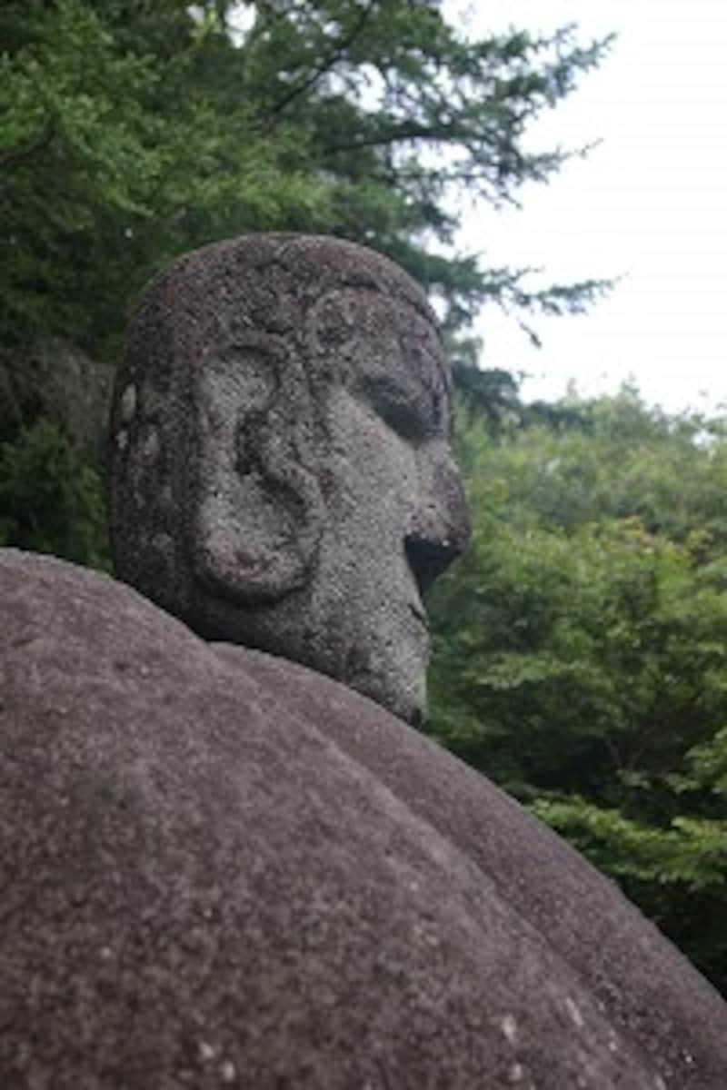 一見、仏様には見えませんが、印相を見ると、阿弥陀如来だとわかります。昔、春宮の鳥居を作るために、今は胴体に使われている巨石にノミを入れると、そこから血が噴出しました。これは霊が宿る石だとわかり、頭をつけ、阿弥陀如来として祀ったという伝説が残っているそうです。