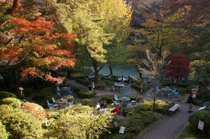 | 渓谷沿いのお店は、紅葉を愛でる人で賑わっています |