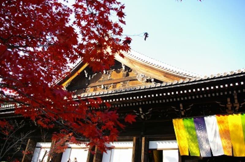 こちらは、法然上人によって開かれた浄土宗の一派、西山浄土宗の総本山で、法然上人がはじめて念仏の法門を説かれた地でもあります。 修行をする若い僧侶も多く、数々のお堂があります。紅葉はどこを見ても美しいですが、とりわけ、女人坂と呼ばれる緩やかで長い石段の散りもみじが有名です。